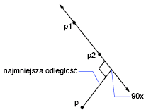 Określa najkrótszą odległość między punktem p oraz linią przechodzącą przez punkty p1 i p2.