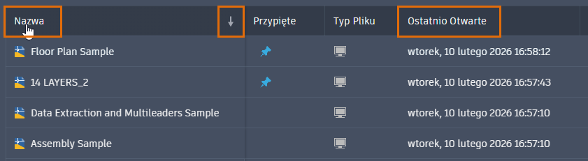 - Widok listy: kliknij nagłówek kolumny Nazwa lub Ostatnio otwarte, aby posortować dokumenty. Aby odwrócić porządek sortowania, kliknij pionową strzałkę po prawej stronie metody sortowania.