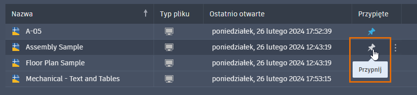 - Widok listy: przesuwaj wskaźnik myszy do kolumny Przypięte, aż pojawi się ikona pinezki. Kliknij, aby przypiąć plik.