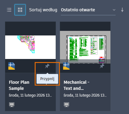 - Widok siatki: przesuwaj wskaźnik myszy w lewą górną część miniatury pliku, aż pojawi się ikona pinezki. Kliknij, aby przypiąć plik.