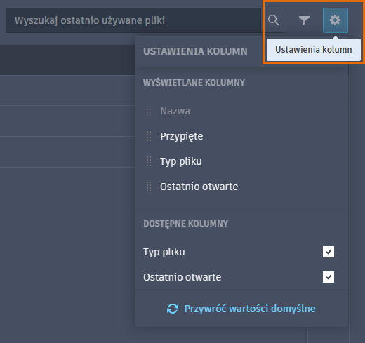Ikona ustawień kolumny (koła zębatego) w prawym górnym rogu widoku listy umożliwia dostosowanie widoku przez przełączanie wyświetlanych kolumn i kolejności ich wyświetlania. Kolumny Nazwa i Przypięte są zawsze wyświetlane jako odpowiednio pierwsza i ostatnia kolumna.
