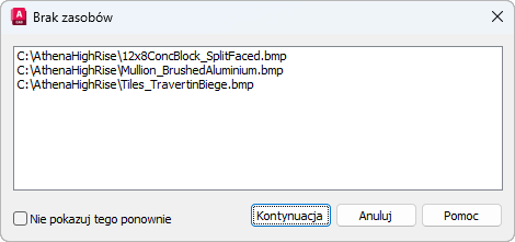 To okno dialogowe jest wyświetlane, jeśli ścieżka map tekstur, za pomocą których miała być renderowana prezentacja, przestała być dostępna. Może to być spowodowane na przykład przeniesieniem lub usunięciem map tekstur albo przeniesieniem pliku rysunku na komputer z innymi mapowaniami dysków.