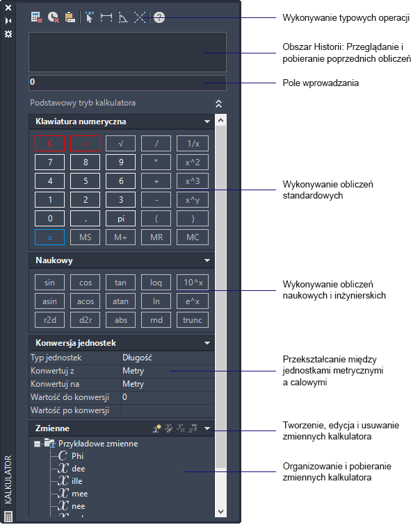 Kalkulator oprócz podstawowych funkcji występujących w kalkulatorach naukowych zawiera funkcje geometryczne, konwersje jednostek i zmienne.