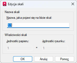Podaj nazwę opisową lub liczbową. Na przykład w rysunku architekturalnym z typową skalą calową można podać 1”=4’ lub 1:48.