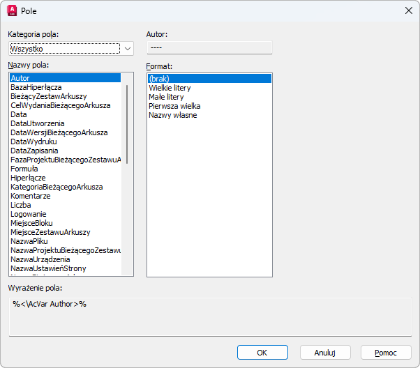 Po wybraniu ObiektNazwany z listy Nazwy pól, wyświetla nazwy wszystkich obiektów wybranego typu w rysunku. Gdy zostanie wybrany Obiekt z listy Nazwy pól, zostanie wyświetlona lista właściwości wybranego obiektu, które będą dostępne w postaci pól. Gdy zostanie wybrany blok z atrybutami, na liście właściwości pojawią się nazwy atrybutów.