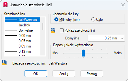 Ustawia bieżącą szerokość linii i jednostki szerokości linii, steruje wyświetlaniem i skalą wyświetlania szerokości linii oraz ustawia wartość szerokości linii DOMYŚLNA dla warstw.