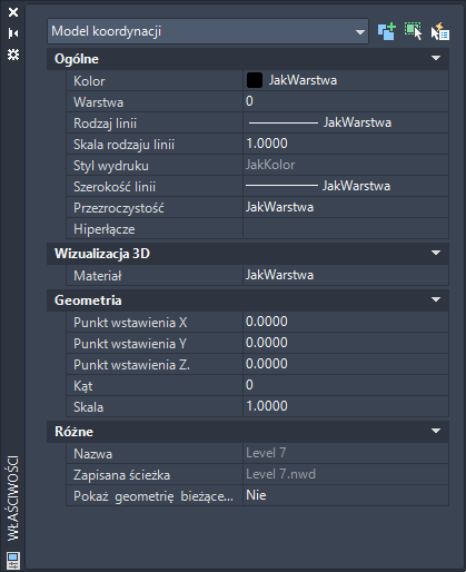 Model koordynacji jest aktualizowany w czasie rzeczywistym wraz ze zmianami ustawień na palecie Właściwości.