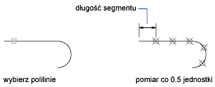 Na ilustracji pokazano, w jaki sposób polecenie ZMIERZ zaznacza odległości 0.5 jednostki wzdłuż polilinii, gdy dla zmiennej systemowej PDMODE jest ustawiona wartość 35.