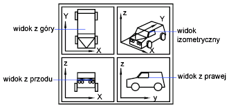 Orientacja widoku określonego widoku ortogonalnego jest oparta na zmiennej systemowej UCSBASE, która jest domyślnie ustawiona na globalny układ współrzędnych. Kiedy jest wywoływany jeden z widoków prostokątnych, program powiększa go do zakresu bieżącej rzutni.