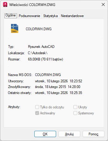 Wyświetla informacje tylko do odczytu dotyczące pliku rysunku, które są pobierane z systemu operacyjnego.