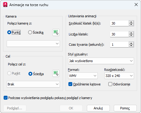 Wyświetla ruch kamery dla animacji w rzutni. Jeśli wybrano opcję „Podczas wyświetlania podglądu pokazuj podgląd z kamery”, w oknie dialogowym Podgląd animacji jest również wyświetlany podgląd animacji.
