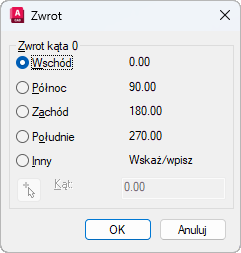 Ustala kierunek kąta zero. Podane opcje wpływają na wprowadzanie kątów, format wyświetlania i wprowadzanie współrzędnych biegunowych, walcowych i sferycznych.