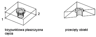 Ustawia pierwszy z dwóch punktów definiujących orientację płaszczyzny cięcia. Użycie tej opcji powoduje, że płaszczyzna cięcia zawsze pozostaje prostopadła do płaszczyzny XY bieżącego układu LUW. Po określeniu drugiego punktu na płaszczyźnie można wybrać, czy zachować obie strony przeciętego obiektu, lub można określić inny punkt na stronie płaszczyzny do zachowania.