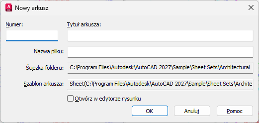 Tworząc nowy arkusz, można usunąć numer arkusza z nazwy pliku, jednak numer arkusza nadal będzie w nazwie układu.