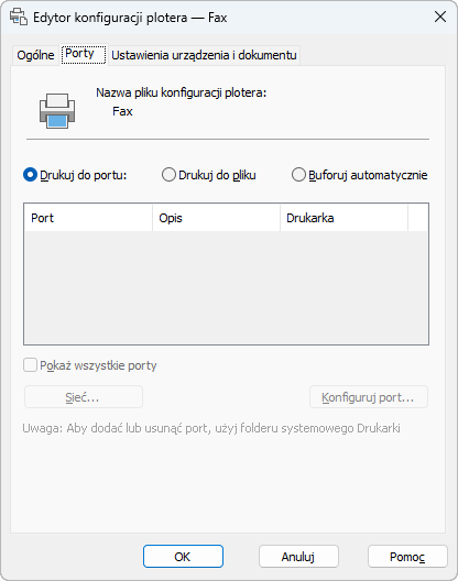 Wyświetla wszystkie dostępne w komputerze porty, niezależnie od portów dostępnych dla plotera.