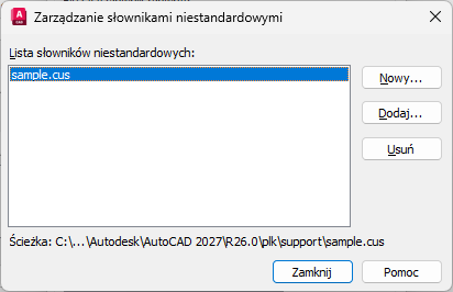 Umożliwia dodanie istniejącego słownika niestandardowego z list plików.