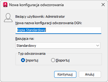 Otwiera okno dialogowe Zmień konfigurację odwzorowania DGN. W zależności od wybranego typu odwzorowania (Import lub Eksport) jest otwierane odpowiednie okno dialogowe importu/eksportu.