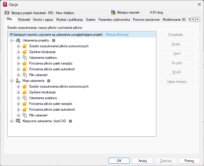 Aby uzyskać informacje na temat zmiany ścieżek dla połączonych plików pomocniczych, zobacz Konfigurowanie ścieżek dla połączonych plików pomocniczych projektu Autodesk.