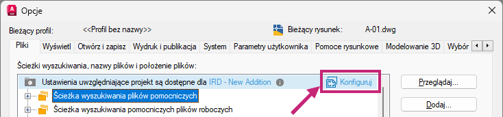 Uwaga: Jeśli nie widzisz opcji Konfiguruj, być może projekt został już wcześniej skonfigurowany. Można to zweryfikować na przykładzie wyglądu tekstu „W bieżącym rysunku używane są ustawienia uwzględniające projekt”.