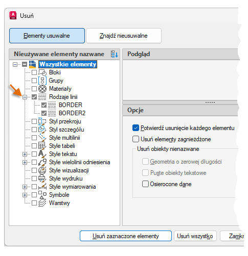 Aby usunąć wszystkie rodzaje linii bez odniesień, wybierz Rodzaje linii.