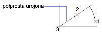 Rysuje łuk przeciwnie do kierunku ruchu wskazówek zegara od początku (1) do końca, który leży na urojonej półprostej rysowanej od środka (3) przez drugi określony punkt (2).