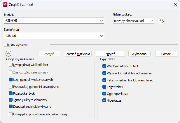 Jeśli na przykład chcesz zmienić podpis wszystkich podobnych części na rysunku na 4384K61, wprowadź 4384K6? w polu Znajdź i 4384K61 w polu Zamień na.