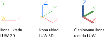 Ikona LUW pomaga w wizualizacji bieżącej orientacji lokalnego układu współrzędnych względem bieżącego kierunku obserwacji. Dostępnych jest kilka wersji tej ikony. Można zmieniać ich rozmiar, położenie i kolor.