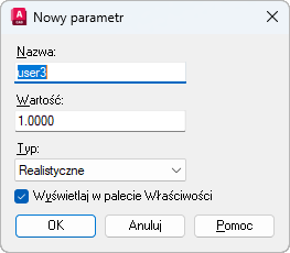 Określa typ nowego parametru. Typy parametrów, które można wybrać: rzeczywisty, odległość, pole, objętość, kąt lub ciąg.