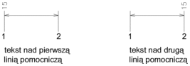 Tekst jest umieszczany między liniami pomocniczymi tylko wtedy, gdy segmenty mają przynajmniej długość odstępu od tekstu. Tekst powyżej lub poniżej linii wymiarowej jest umieszczany między liniami tylko kiedy po umieszczeniu grotów strzałek, tekstu wymiarowego i marginesu pozostanie miejsce na odstęp od tekstu. (DIMGAP — zmienna systemowa)
