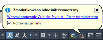 Po dołączeniu odnośników zewnętrznych do rysunku program sprawdza co jakiś czas, czy pliki, do których prowadzą odniesienia, uległy zmianom od ostatniego wczytania odnośników zewnętrznych. Powiadamianiem o odnośnikach zewnętrznych steruje zmienna systemowa XREFNOTIFY.