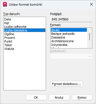 W zależności od wybranego typu danych wyświetla listę stosownych typów formatu. Na przykład, jeśli zostanie wybrany typ Kąt, wówczas lista Format będzie zawierać takie opcje, jak Stopnie dziesiętne, Grady, Radiany itp.