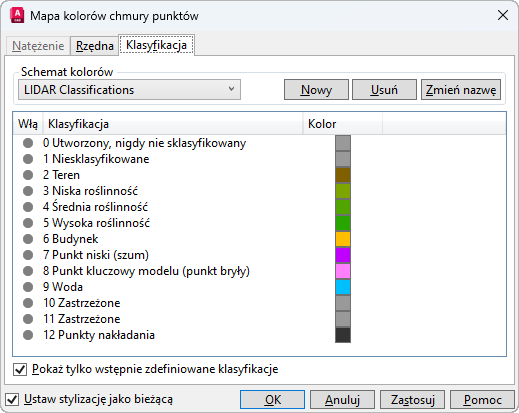 Edytuje ustawienia schematu kolorów dla stylizacji chmury punktów Klasyfikacja.