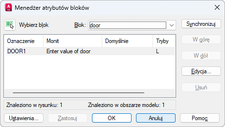 Pozwala edytować definicje atrybutów w blokach, usuwać atrybuty z bloków i zmienić kolejność, w jakiej będą się pojawiać monity dotyczące wprowadzania wartości atrybutów podczas wstawiania bloku.