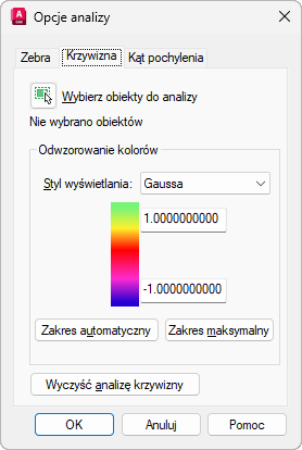 Umożliwia anulowanie wyświetlania analizy krzywizny na wszystkich obiektach w bieżącym rysunku.