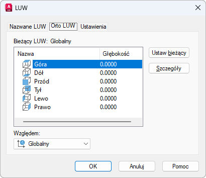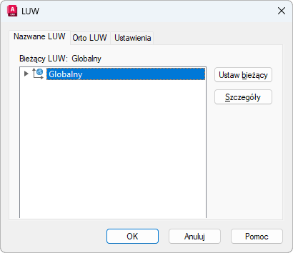 Wyświetla listę układów współrzędnych zdefiniowanych w bieżącym rysunku. Strzałka oznacza bieżący układ LUW.