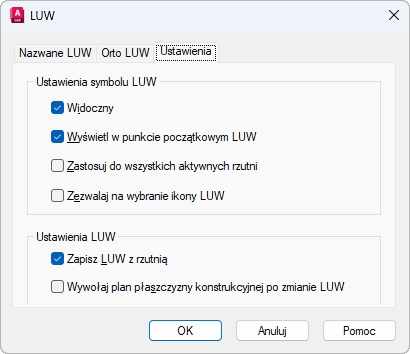 Określa ustawienia wyświetlania ikony układu LUW w bieżącej rzutni.