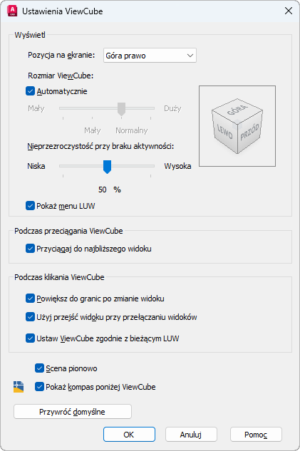Zmień ustawienia narzędzia ViewCube zgodnie z potrzebami.