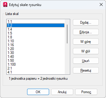 Steruje listą skal dostępnych w przypadku rzutni układu, układów stron i drukowania.