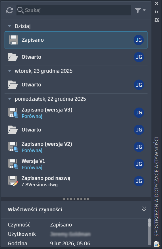 Funkcja Spostrzeżenia dotyczące aktywności rejestruje aktualizacje wprowadzone przez każdego współpracownika w pliku rysunku, usprawniając współpracę i ułatwiając wznowienie pracy od miejsca, w którym została przerwana.
