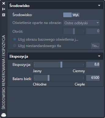 Paleta Środowisko renderowania i ekspozycja służy do ustawiania oświetlenia globalnego sceny.