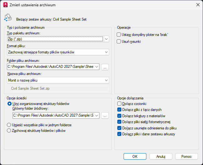 Włącza do pakietu archiwum pliki z danymi zestawu arkuszy (DST), pliki rysunkowe z blokami etykiet, pliki rysunkowe z blokami objaśnień oraz pliki szablonów rysunkowych (DWT).