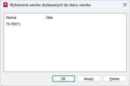 Wyświetla nazwę i opis warstw, które nie zostały dodane do stanu warstw. Wybierz warstwy, które chcesz dodać, a następnie kliknij przycisk OK.