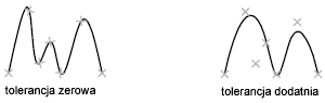 Określa odległość, na jaką splajn jest może odchylać się od określonych punktów dopasowania. Wartość tolerancji 0 wymaga, aby otrzymany splajn przechodził bezpośrednio przez punkty dopasowania. Wartość tolerancji ma zastosowanie do wszystkich punktów dopasowania, z wyjątkiem początkowego i końcowego punktu dopasowania, dla których tolerancja wynosi zawsze 0.