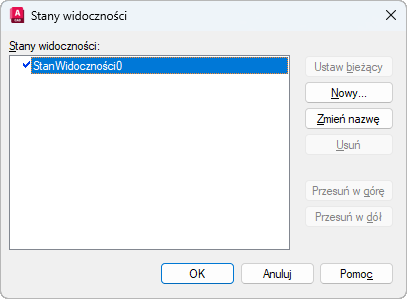 Ustawia wybrany stan widoczności jako bieżący stan do wyświetlenia w Edytorze bloku. Nie zmienia domyślnego stanu widoczności, który jest wyświetlany podczas wstawiania bloku do rysunku, ani nie zmienia wyświetlanego stanu widoczności odniesień do bloków, które są już wstawione i edytowane w rysunku.