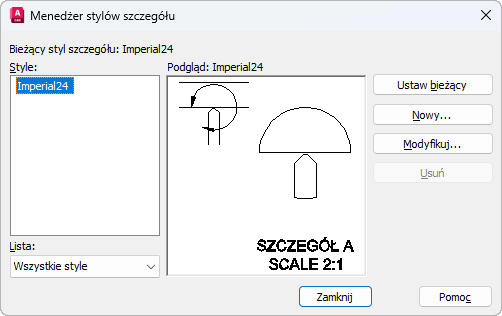 Wyświetla listę stylów szczegółu dostępnych w bieżącym pliku rysunku. Bieżący styl jest wyróżniony.