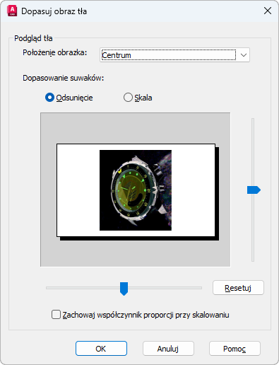 Opcje sterowania obrazem tła zastosowanym do nazwanego widoku obszaru modelu.