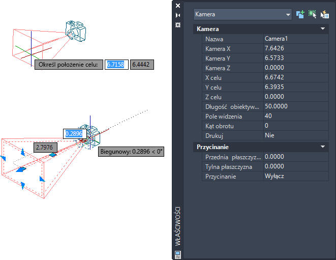 Można zmodyfikować długość obiektywu kamery, zmienić jej przednią i tylną płaszczyznę tnącą, nadać jej nazwę oraz włączyć lub wyłączyć obraz wszystkich kamer na rysunku.