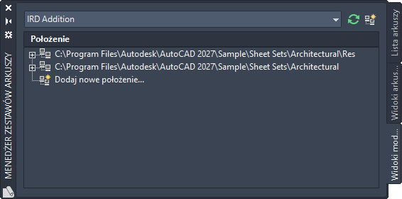 Można dodać lub usunąć położenia folderów, aby określić, które pliki rysunków są dostępne dla bieżącego zestawu arkuszy.