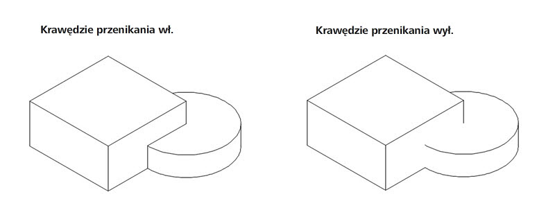 Powoduje wyłączenie lub włączenie widoczności krawędzi przenikania. Krawędzie przenikania występują, gdy jedna lub więcej brył przecina się ze sobą. Gdy widoczność krawędzi przenikania jest włączona, program rysuje linię w miejscu zetknięcia brył.