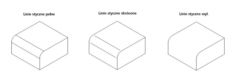 Krawędzie styczne pomniejszone. Skraca długość krawędzi stycznych, aby odróżnić je od krawędzi widocznych. Ta opcja będzie dostępna wyłącznie wtedy, gdy zostanie wybrana opcja Krawędzie styczne.